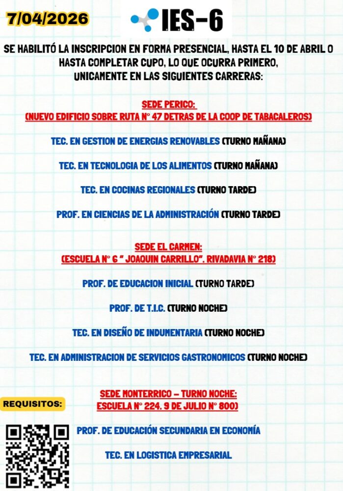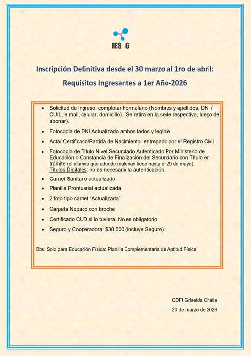 IES N° 6. PREINSCRIPCIÓN CICLO LECTIVO 2026.