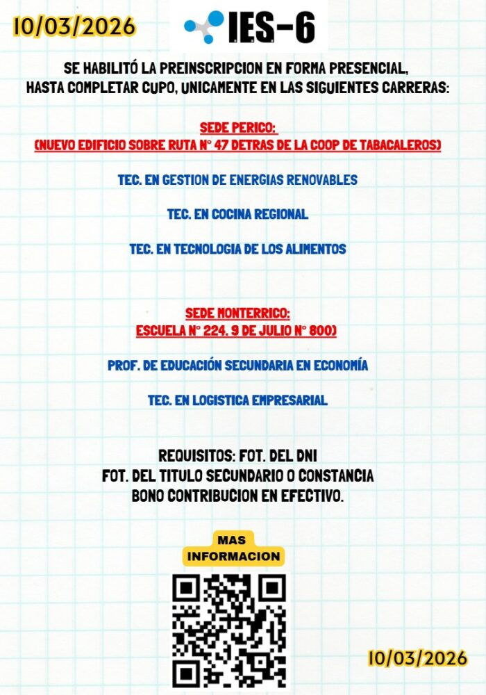 El Instituto de Educación Superior Nº 6 (IES Nº 6) de la Provincia de Jujuy forma parte del Sistema de Educación Superior de Gestión Estatal. La Institución Integra tres sedes: Perico, Monterrico y El Carmen. A través de la Web, el IES Nº 6 constantemente vehiculiza información sobre su vida institucional (Sitio Web), promueve el contacto permanente con la comunidad educativa y constituye una herramienta pedagógica de vital importancia para el fortalecimiento académico (Campus Virtual). Junto a cientos de los Institutos del país, integramos la Red Virtual de Institutos Superiores de Formación Docente coordinada por el INFOD (Instituto Nacional de Formación Docente).
